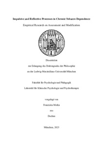 | Motka, Franziska (2025): Impulsive and reflective processes in chronic tobacco dependence: empirical research on assessment and modification. Dissertation, LMU München: Fakultät für Psychologie und Pädagogik |