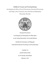 | Göhre, Isabelle (2026): Childhood trauma and psychopathology: investigating the role of social functioning, emotional processing, and sleep in Post-Traumatic Stress Disorder and Borderline Personality Disorder. Dissertation, LMU München: Fakultät für Psychologie und Pädagogik |
