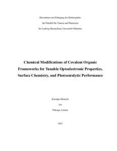 | Paliušytė, Klaudija (2026): Chemical modifications of covalent organic frameworks for tunable optoelectronic properties, surface chemistry, and photocatalytic performance. Dissertation, LMU München: Fakultät für Chemie und Pharmazie |