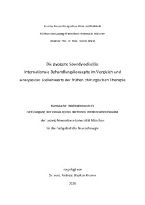 | Kramer, Andreas Stephan (2026): Die pyogene Spondylodiszitis: internationale Behandlungskonzepte im Vergleich und Analyse des Stellenwerts der frühen chirurgischen Therapie. Habilitationsschrift, LMU München: Medizinische Fakultät |