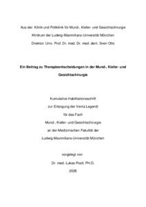 | Postl, Lukas (2026): Ein Beitrag zu Therapieentscheidungen in der Mund-, Kiefer- und Gesichtschirurgie. Habilitationsschrift, LMU München: Medizinische Fakultät |